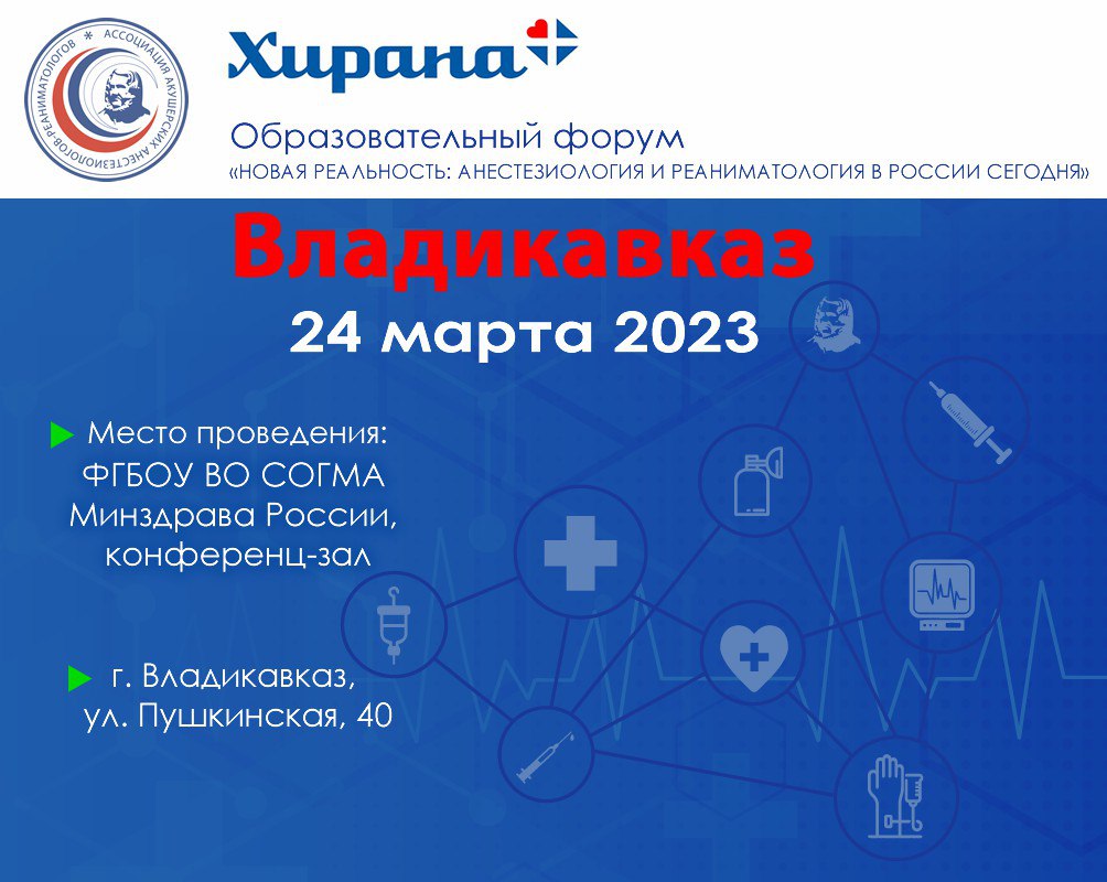 Компания Хирана+ приглашает всех жителей Северного Кавказа 24 марта 2023г. на Образовательный форум «Новая Реальность: Анестезиология и реаниматология в России сегодня» в г. Владикавказ. Участие бесплатное.