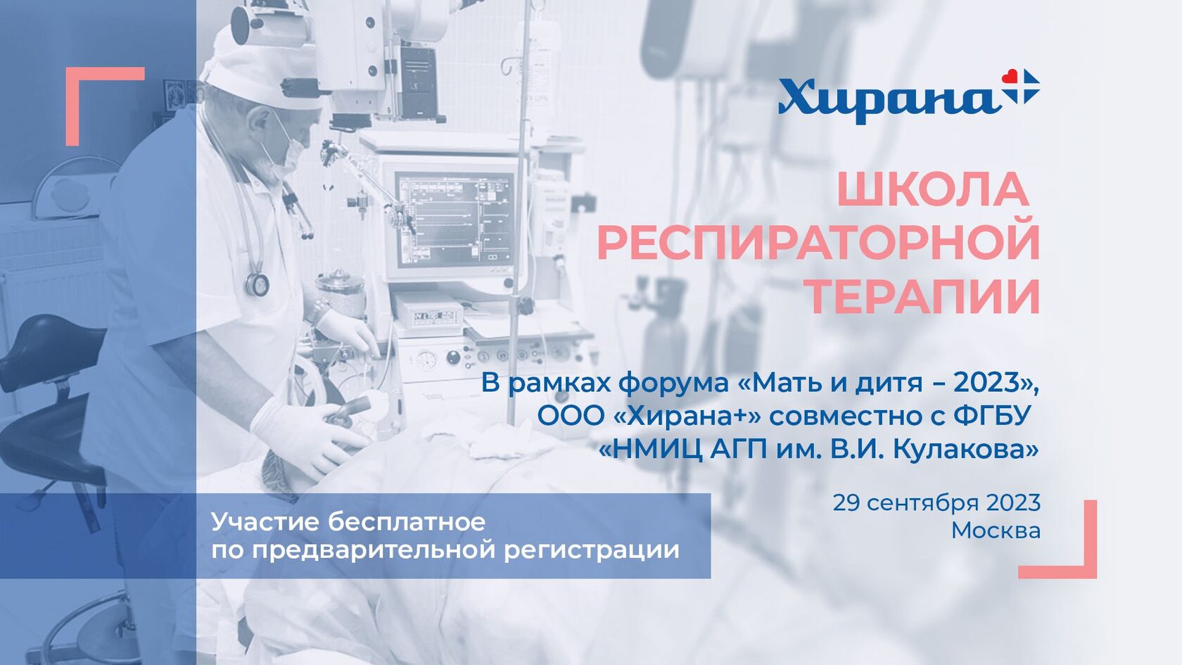 Уважаемые врачи, коллеги и партнеры! Приглашаем вас на БЕСПЛАТНЫЙ практикум «Школа респираторной терапии «Хирана+» 29 сентября. Занятия организуются совместно с ФГБУ «НМИЦ АГП им. В. И. Кулакова» в рамках форума «МАТЬ И ДИТЯ–2023».